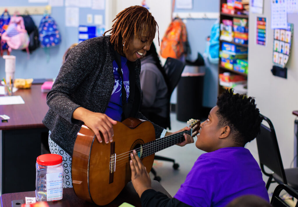CAP music therapist Brittany Harmon working with a student at Growing Together Behavioral Center | Photo by Toni Smailagic of Cre8Jax